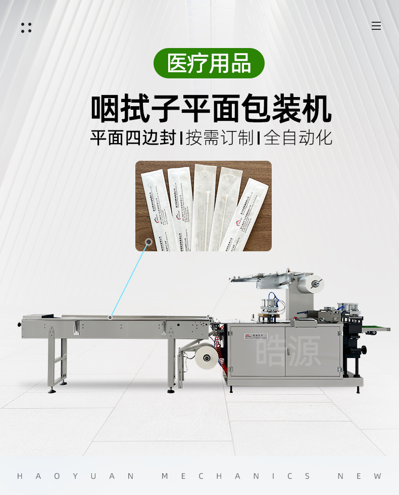 咽拭子包裝機 平面四邊封包裝機 拉伸膜紙塑包裝機 醫(yī)用輔料 紗布 棉球 等消毒包裝機 浙江皓源機械 13326195526
